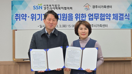 경주시가족센터는 지난 3일 경주시사회복지협의회(회장 박경복)와 취약·위기가정에 대한 통합지원 체계 강화를 위해 업무협약을 체결했다. 이번 협약은 올해 본격 추진되는 ‘온가족보듬사업’의 안정적 운영을 기반으로 사례관리의 연속성과 지역자원 연계의 실효성을 높이고, 위기가정에 대한 조기 발굴‧지원 체계를 강화하기 위해 마련됐다.협약에 따라 양 기관은 △취약·위기가족 발굴 및 공동 지원 체계 구축 △통합사례관리 대상자 정보 공유 △기관별 자원 및 지원사업 공유 △기타 상호 협력이 필요한 사항 등에 대해 협력하기로 했다. 이를 통해 복합적인 어려움을 겪는 가정에 보다 체계적이고 지속적인 지원이 이뤄질 것으로 기대된다.최인숙 경주시가족센터장은 “이번 협약은 지역사회 복지기관 간 협력 기반을 한층 강화하는 계기가 될 것”이라며 “앞으로도 유관기관과의 협력을 확대해 시민 중심의 가족복지 서비스를 강화해 나가겠다”고 밝혔다.한편, 경주시가족센터는 온가족보듬사업을 통해 가족상담, 사례관리, 보듬매니저 파견, 위기가정 지원 등 통합적 가족서비스를 운영하고 있으며, 지역사회 네트워크를 바탕으로 맞춤형 지원을 확대해 나갈 계획이다.