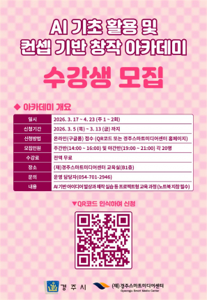 (재)경주스마트미디어센터(김장주 센터장)는 경주시와 협력해 경주시민과 지역 중소기업의 AI 활용 역량 강화를 위한「2026 AI 아카데미」를 운영 한다고 4일 밝혔다.이번 교육 과정은 ▲ AI(인공지능)이해 ▲ AI 활용 기획 및 아이디어 구상 ▲ AI 제작도구 기초(이미지·3D) ▲ AI 제작도구 기초(영상) ▲ AI 제작도구 기초(미니앱) ▲ 미니 포트폴리오 제작[1],[2] ▲ 콘텐츠 제작 발표회 등으로 구성됐다. 참여자는 이 과정을 통해 AI를 활용 콘텐츠 개발과 영상, 앱 등의 결과물을 직접 제작할 수 있는 역량을 갖출 수 있게 된다. 특히 이번 아카데미는 지난해 수강생들의 의견을 최대한 반영하여 다양한 AI 프로그램 활용과 창작에 교육 시간을 늘려 교육 수료 이후 실생활과 직장에서 AI를 활용함에 어려움이 없도록 할 계획이다. 교육 참여자는 3월 5일부터 3월 13일까지 모집하며, 자세한 사항은 경주스마트미디어센터 홈페이지를 통해 확인할 수 있다.(재)경주스마트미디어센터(김장주 센터장)는 “경주시민 누구나 쉽게 AI에 대한 이해와 활용이 가능하도록 커리큘럼을 짜임새 있게 설계했다”라며 “교육 효과가 극대화 될 수 있도록 교육에 최선을 다 하겠다” 고 밝혔다.