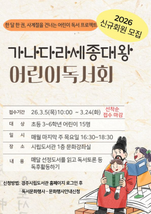 경주시 시립도서관은 어린이들에게 책 읽는 즐거움과 독서의 중요성을 알리기 위해 ‘가나다라 세종대왕 어린이 독서회’를 운영한다. 이번 어린이 독서회는 관내 초등학교 3~6학년을 대상으로 3월 26일부터 12월 24일까지 진행된다.매월 마지막 주 목요일, 시립도서관 1층 문화강좌실에서 총 10회 과정으로 운영될 예정이다. 독서회는 어린이들이 꾸준한 독서 활동을 통해 책에 대한 흥미를 높이고, 독서가 일상 속 자연스러운 습관으로 자리 잡도록 돕기 위해 마련됐다.참가 학생들은 매회 새로운 주제의 도서를 함께 읽고 독서 토론에 참여한다. 이어 글쓰기와 그리기 등 다양한 독후 활동을 통해 생각을 표현하는 시간을 갖는다. 이 과정에서 어린이들의 사고력과 표현력 향상은 물론 또래 간 소통을 통한 사회성 발달과 올바른 가치관 형성에도 긍정적인 도움이 될 것으로 기대된다.시립도서관 관계자는 “스마트기기 사용 증가로 어린이들의 독서환경이 약화되는 상황에서 독서회를 통해 사고력과 표현력 향상은 물론 올바른 독서 습관 형성에도 도움이 될 것으로 기대한다”고 말했다. 참가 신청 및 자세한 사항은 경주시립도서관 홈페이지 ‘독서문화행사’ 게시판을 참고하거나 시립도서관 사서팀(054-779-8913)으로 문의하면 된다.