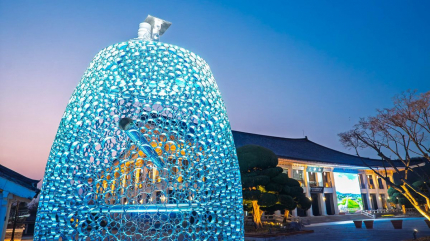 전 세계적인 컴백 열풍을 일으키고 있는 BTS(방탄소년단)의 정규 5집 수록곡 ‘No. 29’가 화제인 가운데, 경주 보문관광단지에 설치된 대형 예술 작품 ‘환영(環影, Void Circle)’이 성덕대왕신종에 대한 완벽한 ‘예술적 오마주(경의)’를 이루며 관심을 끌고 있다. 최근 발매된 BTS의 신곡 ‘No. 29’는 국보 제29호인 성덕대왕신종의 신비로운 종소리와 그 여운인 ‘맥놀이 현상’을 현대적으로 승화시킨 곡이다. 전 세계 아미(ARMY, BTS 팬)들이 천년을 이어온 신라의 소리에 매료된 가운데, 경주 보문관광단지 육부촌(경북문화관광공사 사옥) 앞에는 이 소리를 시각적 예술로 구현한 설치미술 ‘환영’이 그 열기를 잇고 있다.한원석 작가의 ‘환영’은 2,025개의 폐파이프를 정교하게 엮어 성덕대왕신종의 실루엣을 형상화한 높이 4.5m 규모의 대형 설치 작품이다. 지난해 10월, 2025 APEC(아시아태평양경제협력체) 정상회의를 앞두고 경북문화관광공사가 설치했다. 버려진 산업 폐기물이 예술로 재탄생했다는 점에서 BTS가 추구해 온 ‘순환과 회복’의 가치와 맥을 같이 한다.